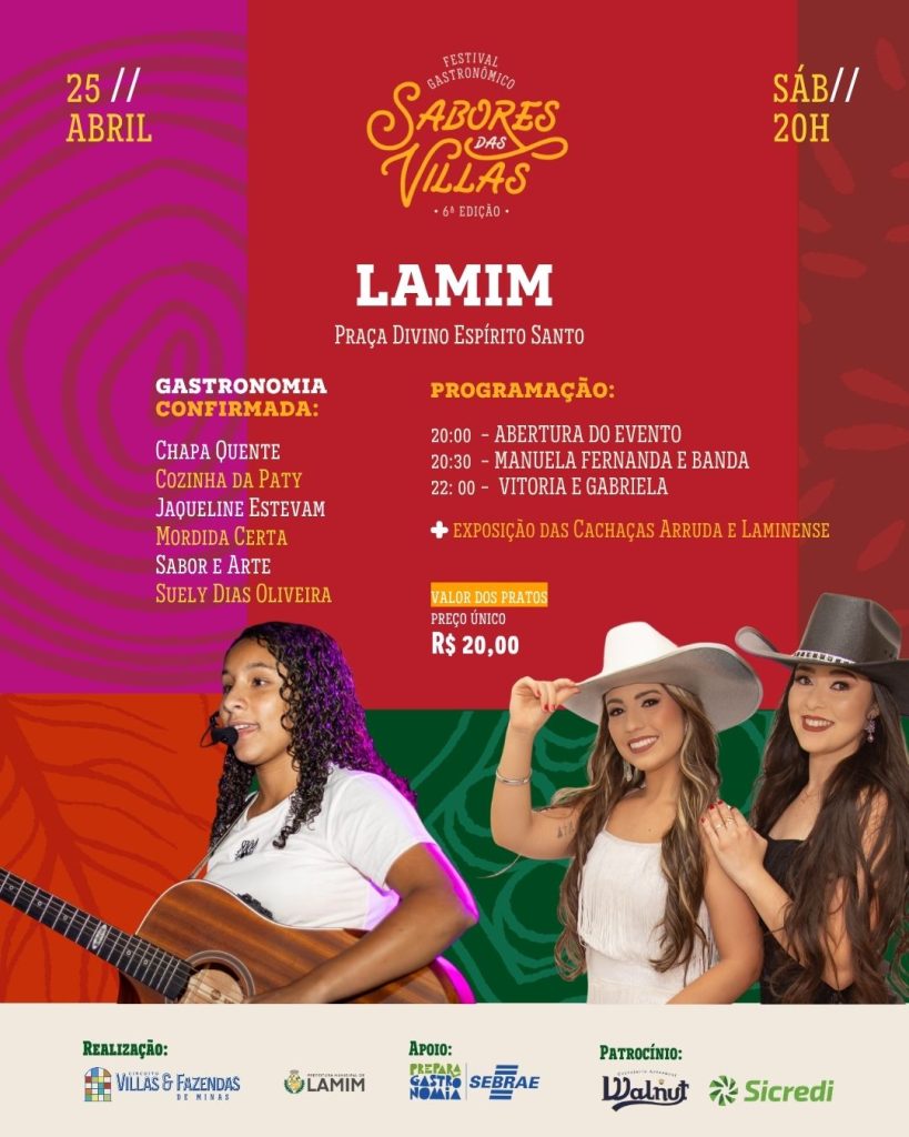 No sábado (25), o evento será realizado em Lamim, na Praça Divino Espírito Santo, a partir das 20h. O público poderá experimentar pratos ao valor único de R$ 20,00. A programação conta com show de Manuela Fernanda e Banda e apresentação da dupla Vitória e Gabriela, além de exposição das cachaças Arruda e Laminense.