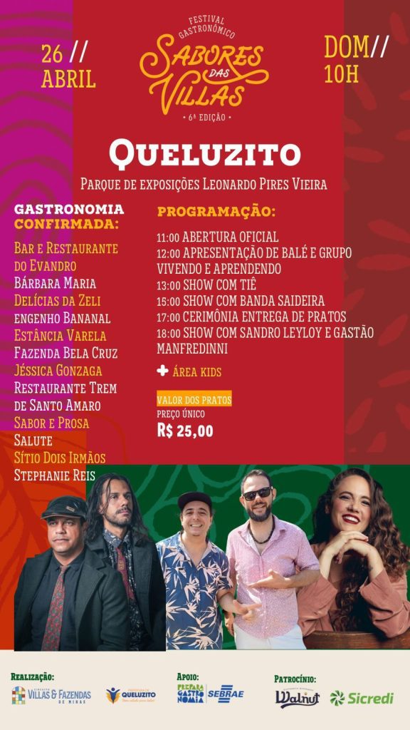No domingo (26), o festival segue para Queluzito, no Parque de Exposições Leonardo Pires Vieira, a partir das 11h. Os pratos serão comercializados a R$ 25,00. A programação inclui apresentação de balé, shows com Tiê, Banda Saideira e Sandro Leyloy e Gastão Manfredinni, além de área kids para o público infantil.