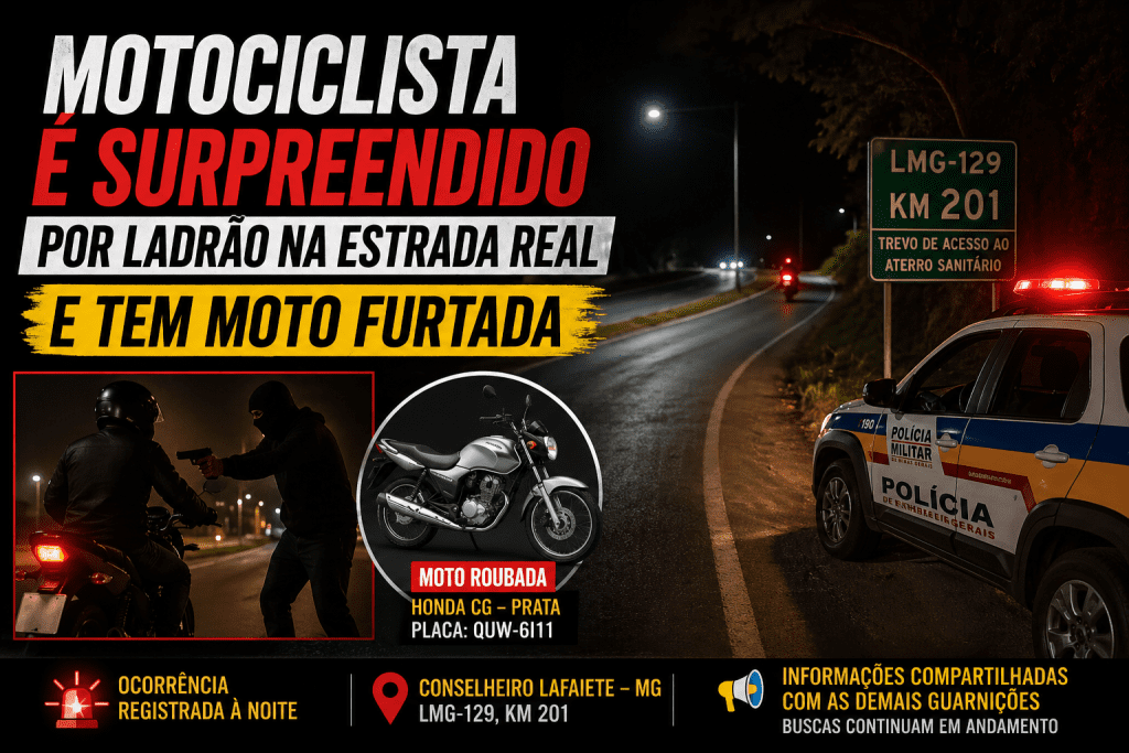 Já no período da noite deste domingo (26), em Conselheiro Lafaiete, a Polícia Militar foi acionada para atender uma ocorrência no km 201 da Rodovia LG-129, na Estrada Real próximo ao trevo de acesso ao aterro sanitário.No local, um homem de 47 anos relatou que seguia em direção a Ouro Branco quando decidiu parar no acostamento. Ao acreditar que o condutor de outra motocicleta se aproximava para pedir informações, acabou sendo surpreendido pelo passageiro do veículo, que anunciou o assalto.